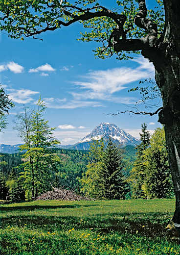 Frühling am Geißenberg: Die noch „angezuckerte“ Felspyramide des Ötscher vom Gipfelrücken. Foto: Franz Hauleitner Bildergalerie (3)