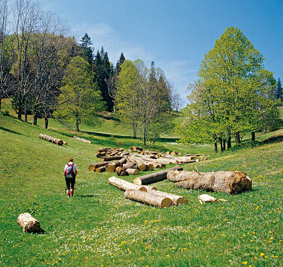 Nun auf rot bezeichneter Forststraße (Nr. 3), an den Waldhängen vorerst nordwärts, dann ostwärts bergab, zuletzt über Wiesen zum Hof Ober Fuchsriegel, 770 m. Beim Stadel oberhalb des Hofs links ab und auf unbezeichnetem Weg an den Hängen (bei Verzweigung geradeaus) nach Norden hinab zu großem Holzkreuz.