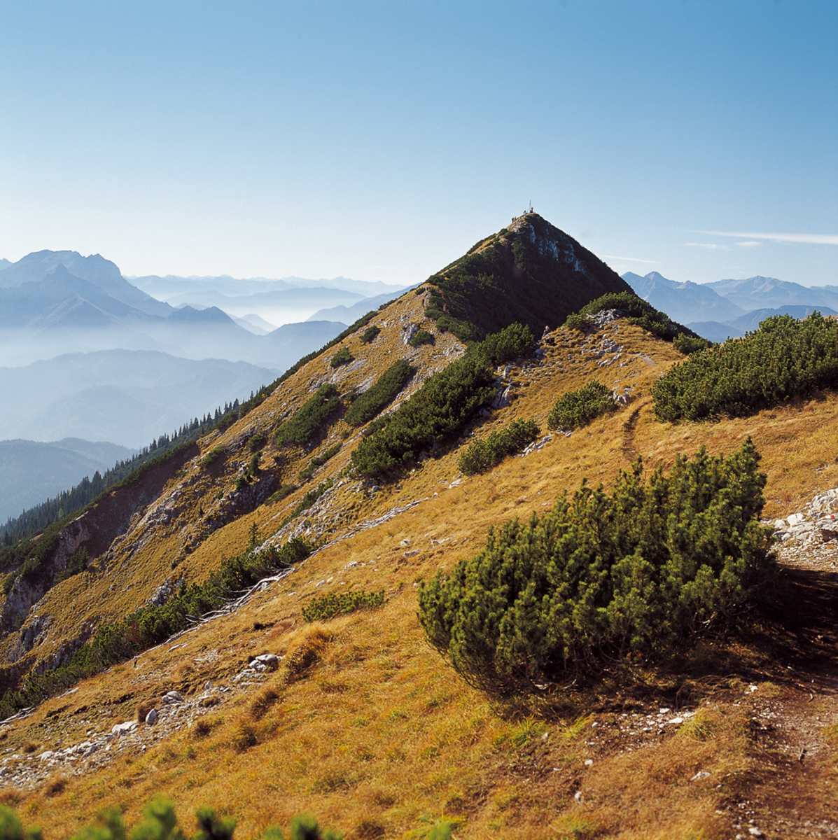 Weiter auf Steigspuren entweder über den flachen, latschenbewachsenen Kamm oder über die felsdurchsetzten Steilwiesen links von ihm (Trittsicherheit nötig) nach Südwesten zum Gipfel des Hochkogels, 1.774 m.