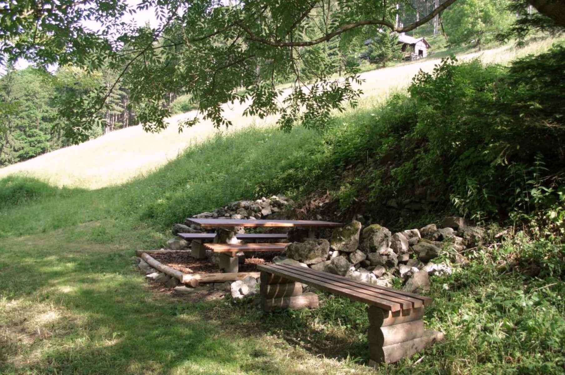 Wir haben nun etwa die Hälfte des Anstiegswegs zurückgelegt und nutzen gerne die Rastmöglichkeit mit Bänken und Tisch neben den letzten Gesteinsresten des alten Bauernhauses "Löbelgraben", das in den 50-er Jahren des vorigen Jahrhunderts aufgegeben wurde.