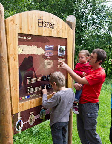 Vom Seethal aus geht es auf einem gut präparierten Weg einmal um den Abtsdorfer See herum. Auf den knapp fünf Kilometern um den See sind einige Attraktionen für Kinder und Familien aufgestellt, die die Natur und die Umwelt näher bringen.