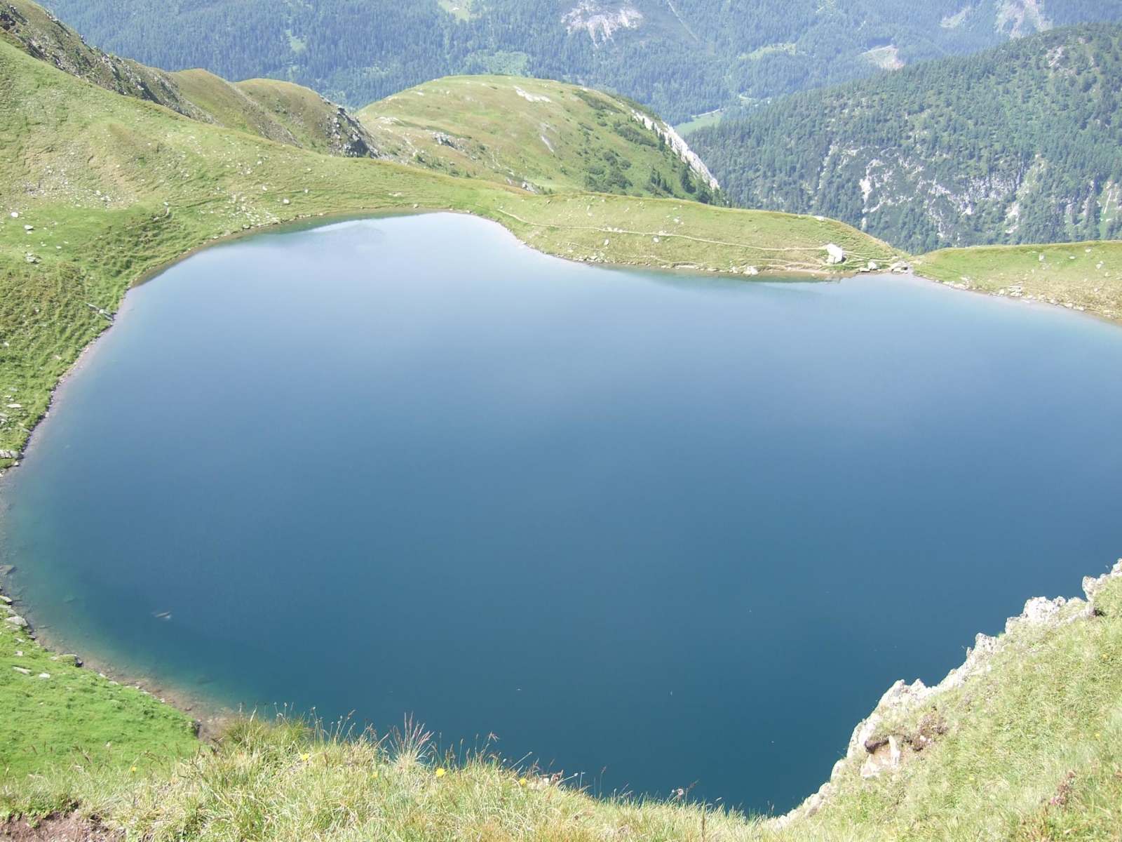 Kurz vor einem Stall zweigt der Weg links ab und führt über sanfte Almböden und zwei steileren Anstiegen zum Twenger Almsee (2.120 m).