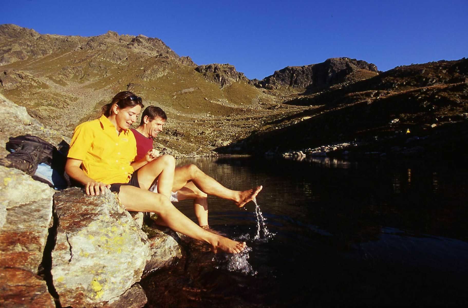 Einfache, aber erlebnisreiche Wanderung in der Samnaungruppe in Tirol: Von der Bergstation Schönjochbahn am Fisser Joch (2.436 m) wandert man über den stellenweise weich gepolsterten Spinnseensteig, auf dem sich beeindruckende Tiefblicke in den Landecker Talkessel eröffnen.