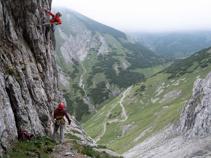 Beim Klettern am Fels sollte auch die sichernde Person einen Helm tragen Foto: Bernhard Fiedler