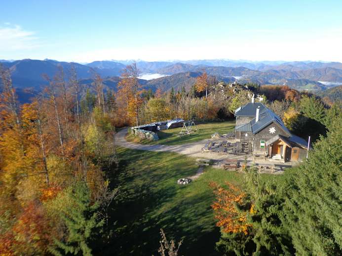 Von oben bietet sich ein herrlicher Blick auf Schneeberg, Ötscher, Dürrenstein, Hochkar, Hochschwab, ins Gesäuse und die Hallermauern und ins Sengsengebirge.