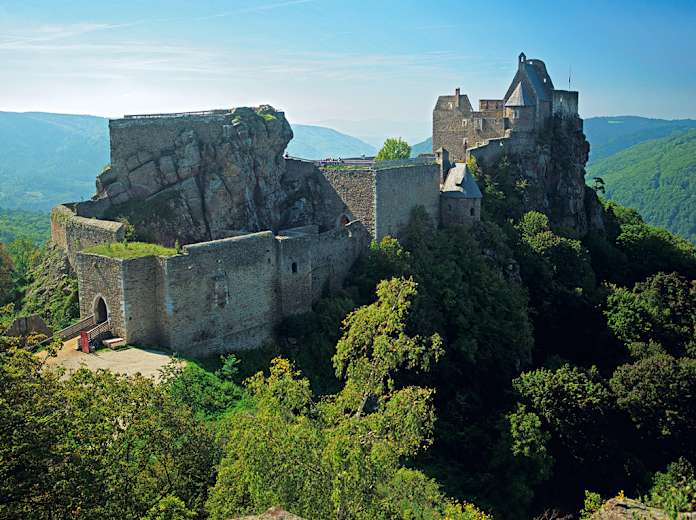 Man erreicht das auf schroffem Felskamm über dem Donautal malerisch postierte Exkastell. Es kann auf kühn angelegten aussichtsreichen „Sichtstegen" lohnend erkundet werden – entweder mit dem Auto vom Ort Aggstein oder schöner zu Fuß vom Dunkelsteiner Wallfahrtsort Maria Langegg (Stiftskirche mit interessanter Scheinarchitektur).