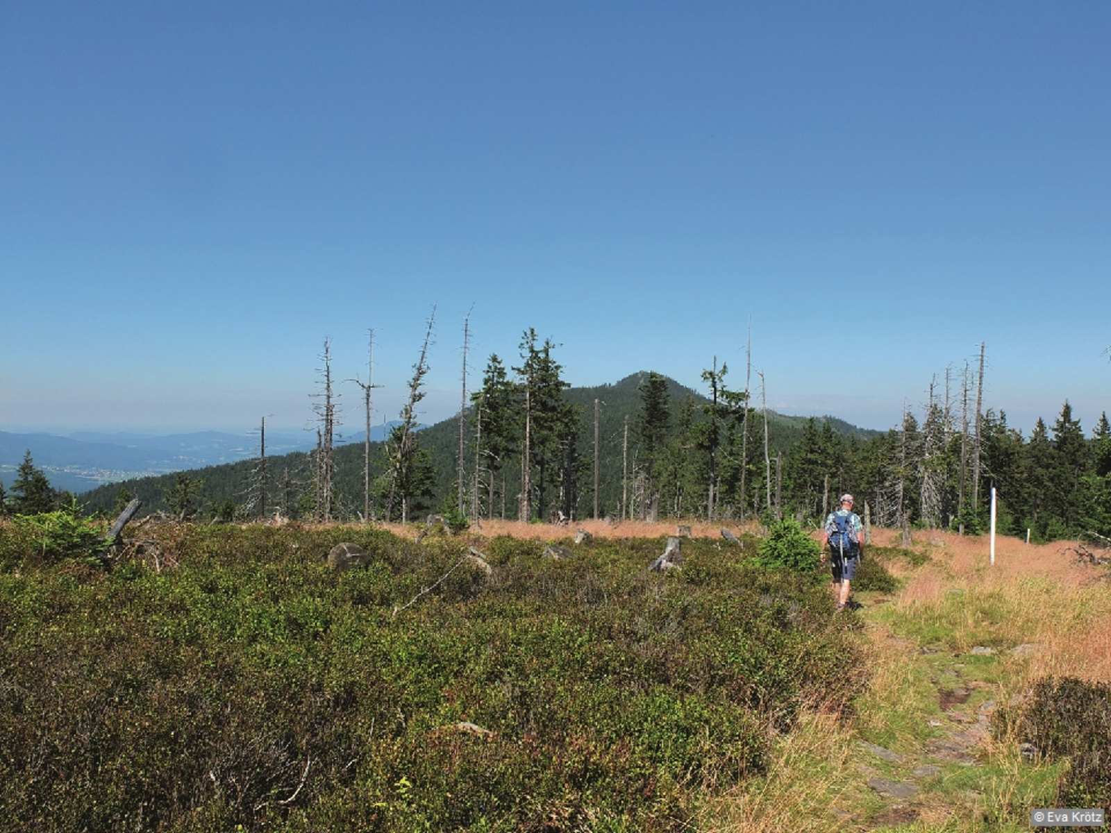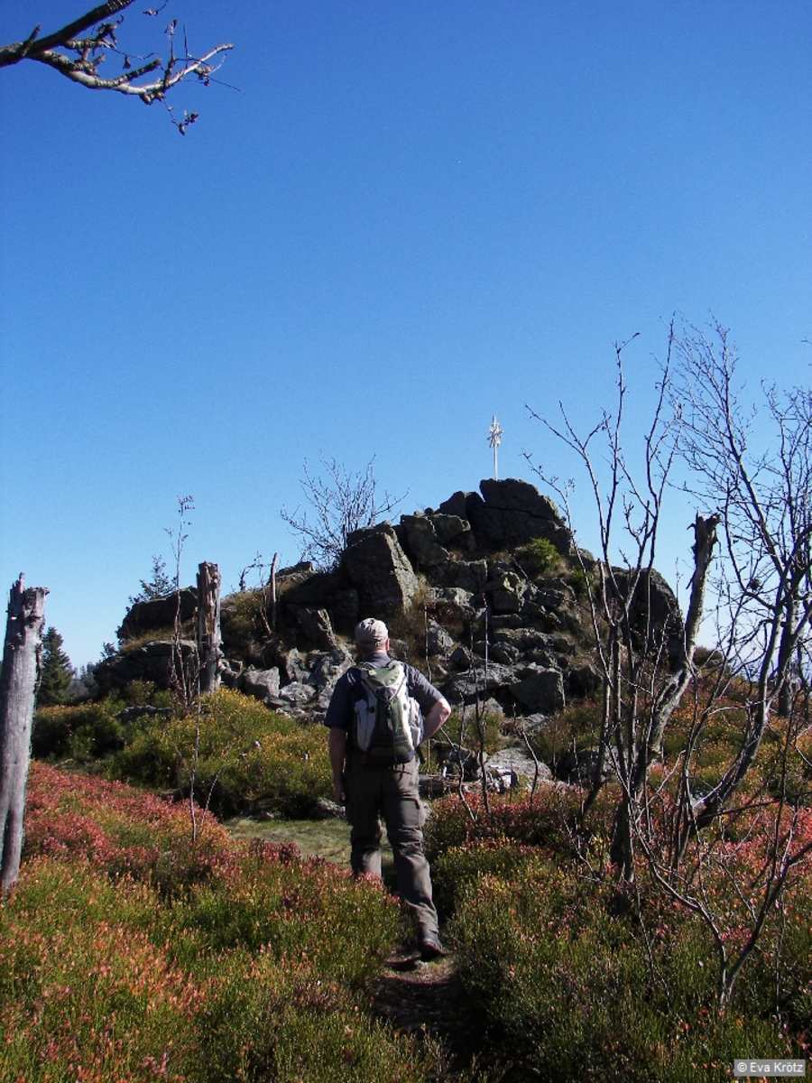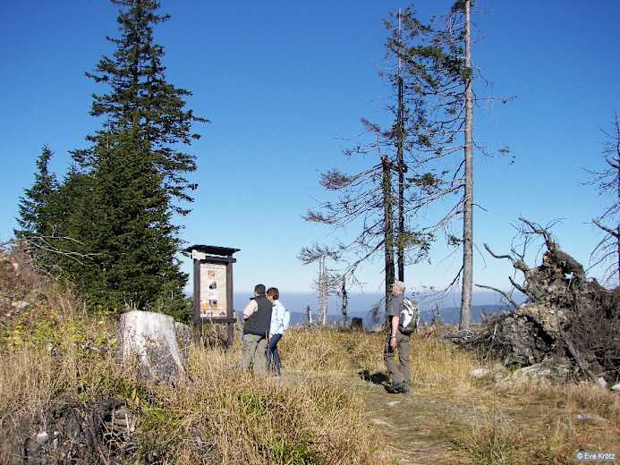 Im Wäldchen beschreibt der Weg eine Rechtskurve, dann zieht der markierte Weg erneut am Hang entlang und stößt auf das „Naturkino“. Mehrere Bänke laden dazu ein, die grandiose Aussicht zu den Ossergipfeln, den Hohenbogen, Haidstein und Kaitersberg zu genießen. Nun sind es nur noch ein paar Schritte zur Felsenkuppe des Zwercheck, 1.333 m. Umgeben von dicken Heidelbeerstäuchern schmückt ein kleines Kreuz den einsamen Aussichtsgipfel. Links von uns verläuft der Grenzweg, ein Pfad führt dorthin. Gehen wir den Grenzpfad ein kurzes Stück nach rechts, gelangen wir zum tschechischen Gipfel des Zwercheck / Svaroh. Nun geht der Blick Richtung Böhmerwald und zum Stausee von Nýrsko. Etwas weiter steht die Infotafel neben den Resten der Juranek-Hütte. Die Berghütte mit großem Restaurant ging mit der Grenzschließung zu Zeiten des Kalten Krieges endgültig unter.