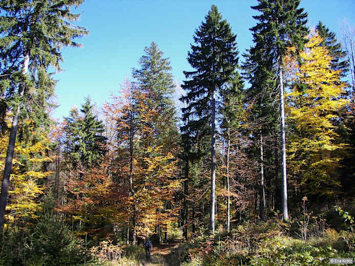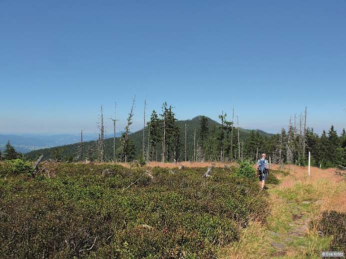 Nach links auf die beiden Bergkuppen der Ossergipfel zu setzen wir unseren Weg fort, dabei dienen uns die weiß-blauen Grenzpfosten als Wegmarkierung. Wir lassen die Totholzregion hinter uns und tauchen auf felsigen Pfaden wieder in den Wald ein. Wir steigen den Lohberger Riegel bergab und erreichen am Velký Kokrhác, 1.229 m, einen Aussichtfelsen. Erneut bergab (Variante 1 biegt ein), um die Felsen des Malý Kokrhác herum und in eine Senke, wobei der Wald immer wieder den Blick nach Tschechien und den Stausee Nýrsko freigibt. Kurz nach dem großen Grenzstein 24 lohnt ein Abstecher nach links zum aussichtsreichen Sesselplatz, einer ehemaligen Bergweide.