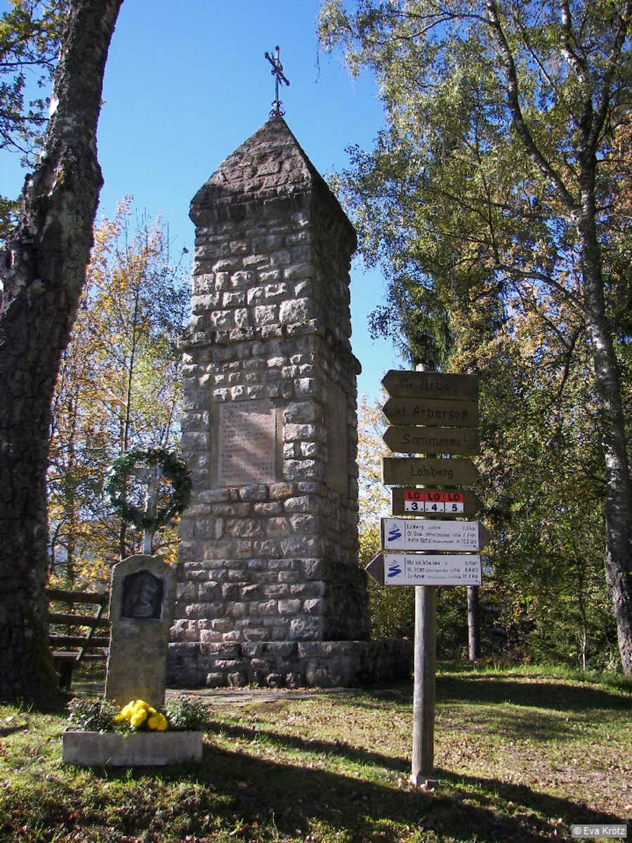Vom Parkplatz unterhalb der Kirche in Lohberg folgen wir dem blauen S des Goldsteigs über die St2154 an der Tourist Information vorbei zu einem Wanderwegweiser. Hier biegen wir mit der Markierung Lo5 links in die Schulstraße. Am nächsten Wegweiser biegt Variante 1 links ab, wir aber gehen geradeaus weiter einen Waldweg hinab über den Perlesbach. Dann steigt der Weg hinauf zu einem Kriegerdenkmal mit Rastbänken und Blick zum Großen Arber.