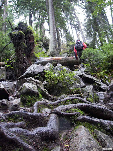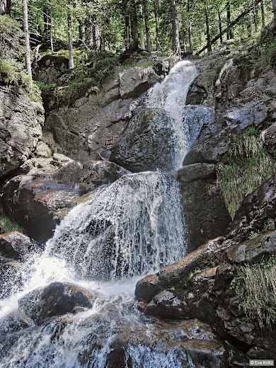 An der unteren Wasserstube wechseln wir die Uferseite, dann geht es steil bergauf, über einen Holzsteg und rechts zu den Rißlochfällen. Über mehrere Kaskaden stürzt hier der Bach in die Tiefe und unter einer Holzbrücke hindurch. Das Rißloch wurde bereits 1939 unter Naturschutz gestellt. Ein kleines Stück zurück zum Wegweiser am Holzsteg, dann folgen wir der 2 (Bo2) weiter Richtung Großer Arber. (Wer will, kann links vom Holzsteg einen Abstecher zum Aussichtspunkt Schweiklruhe unternehmen. Dazu gehen wir über den Steg zurück, dann aber mit der roten 2 (Bo65) rechts den Pfad ca. 10 Min. bergan. An einem herrlich ruhigen Aussichtsplatz steht eine Bank mit Blick über Bodenmais – die Schweiklruhe.)