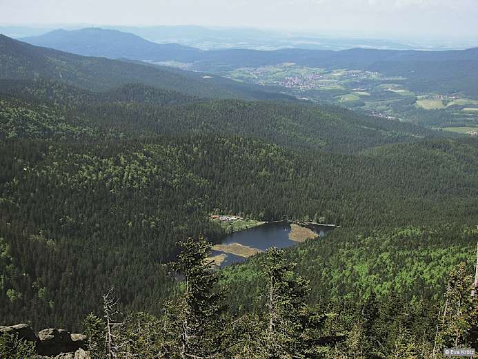 Blick vom Großen Arber zum Kleinen Arbersee. Foto: Eva Krötz, Rother Bergverlag