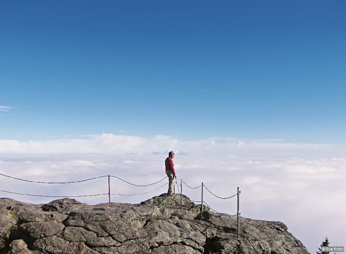 Der Große Arber reckt sein felsiges Haupt durch ein Wolkenmeer in die Sonne. Foto: Eva Krötz, Rother Bergverlag