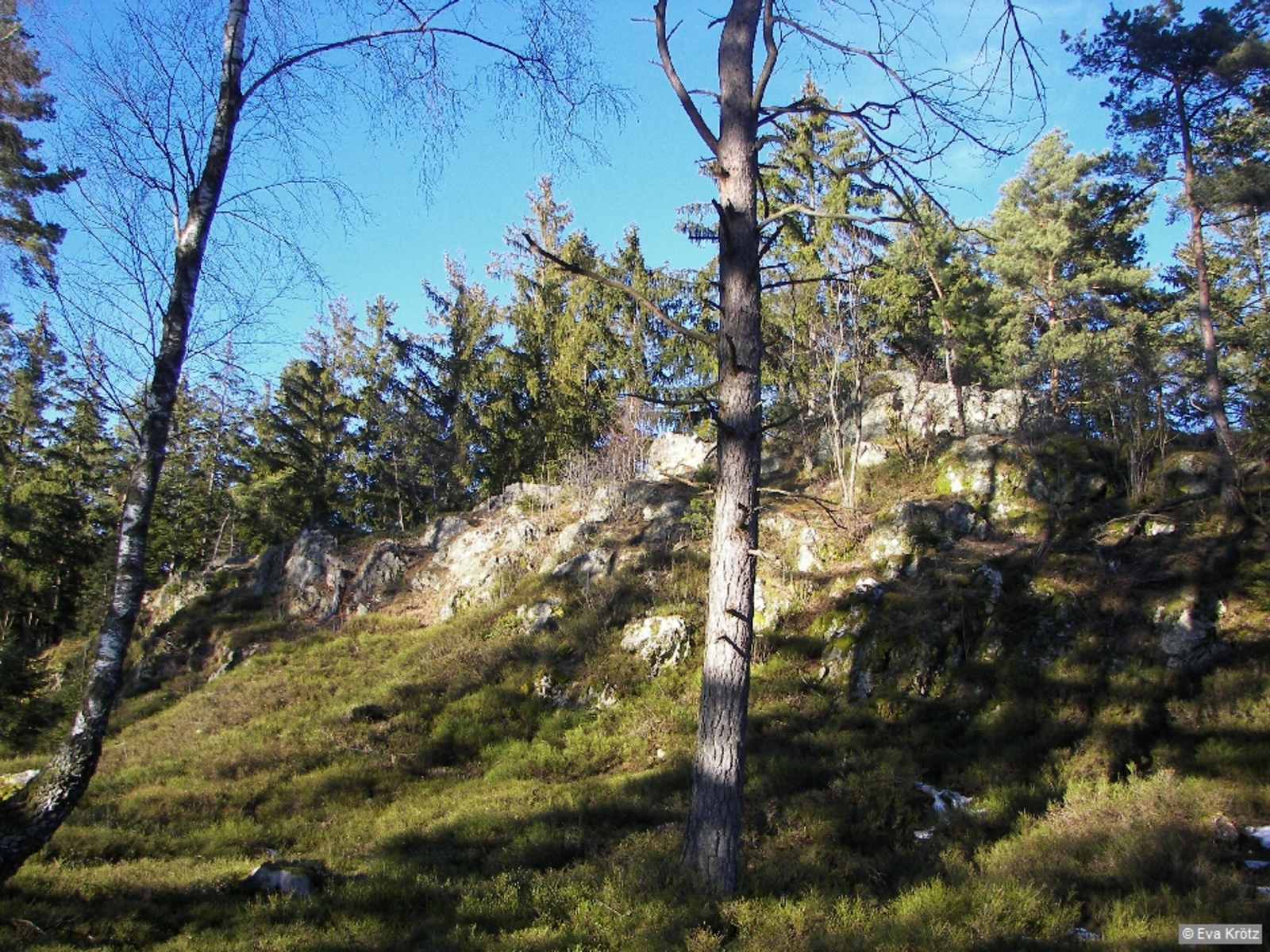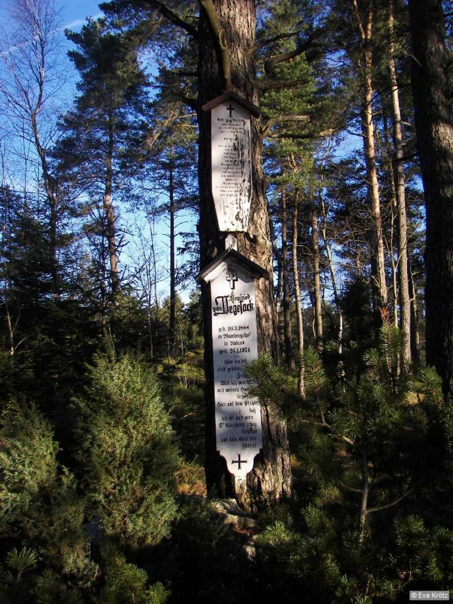 Der breite Waldweg steigt an, biegt nach links und erreicht an einem Wegweiser den Pfahl. Wir wählen für den Hinweg die Sonnenseite und gehen mit der blauen 2 und dem Burglehrpfad (Sonne mit M) geradeaus. Ein Grasweg führt uns am Naturschutzgebiet Pfahl entlang. Die ersten weißen Quarzfelsen ragen auf, und die typische magere Vegetation aus Kiefern, Birken, Heidelbeeren und Pfahlheide dominiert das Bild. Links vor uns liegt der Geißkopf mit seinen Skihängen, und plötzlich taucht die Ruine Weißenstein vor uns auf. Ein herrlicher Rastplatz am Grab des Dichters Siegfried von Vegesack lädt zum Verweilen, bevor wir nach Weißenstein absteigen.