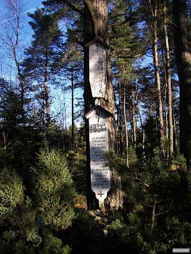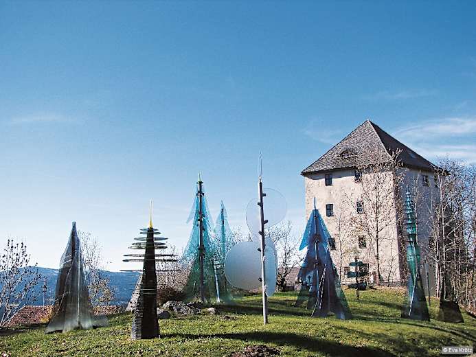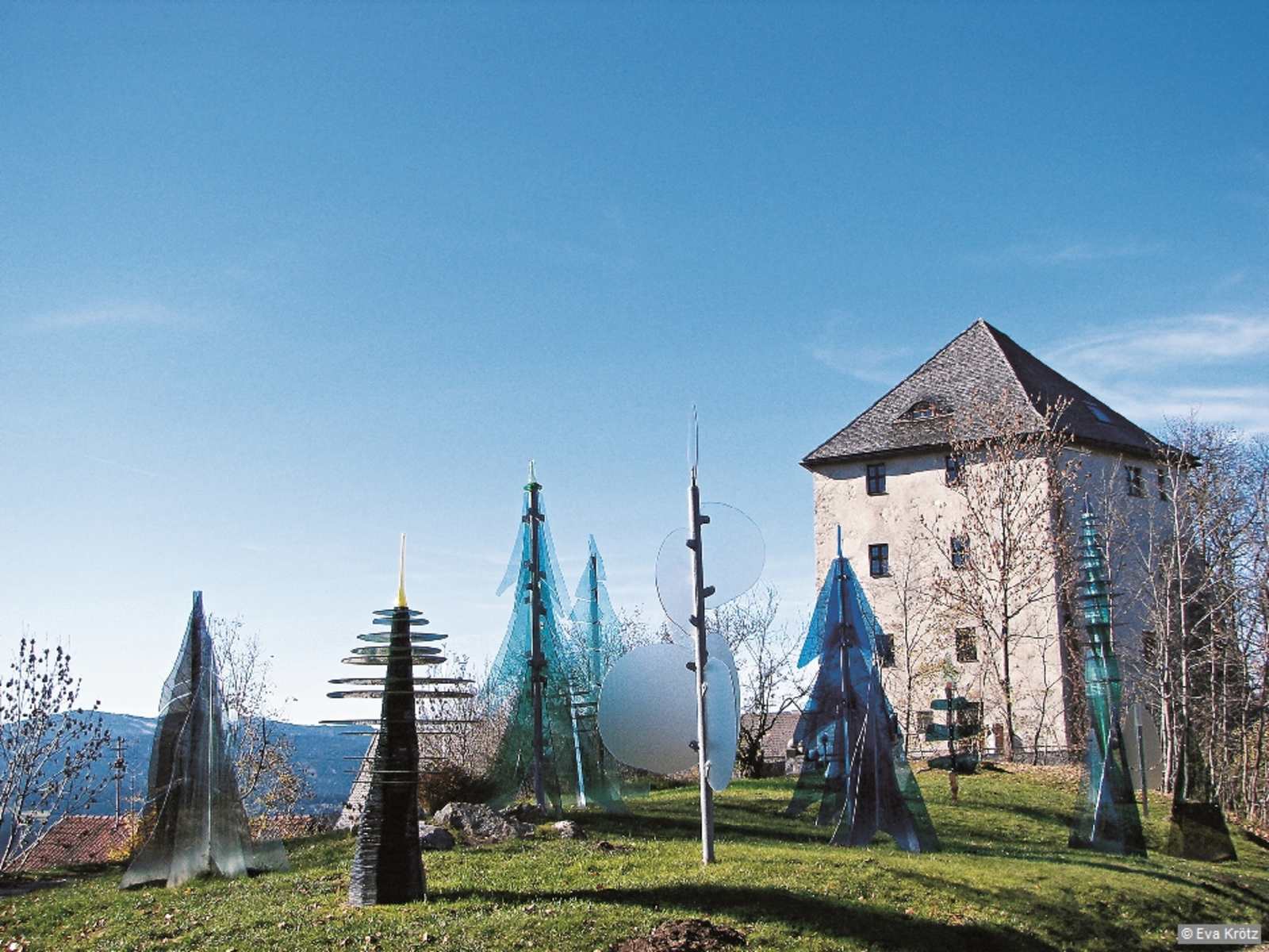 Im Ort mit der blauen 2 geradeaus am Almwirt Weißenstein vorbei zum großen Parkplatz mit Kiosk. Links auf einer Wiese steht ein ganz besonderer Wald – ein in der Sonne in vielen Farben blinkender Gläserner Wald. Doch wieso ein Gläserner Wald am Pfahl? Ganz einfach: Der Pfahl besteht aus Quarz und ist damit ein Grundstoff des Glases, gleichzeitig zeigt es den modernen kreativen Umgang mit dem Werkstoff Glas – ein altes Handwerk setzt neue Akzente!