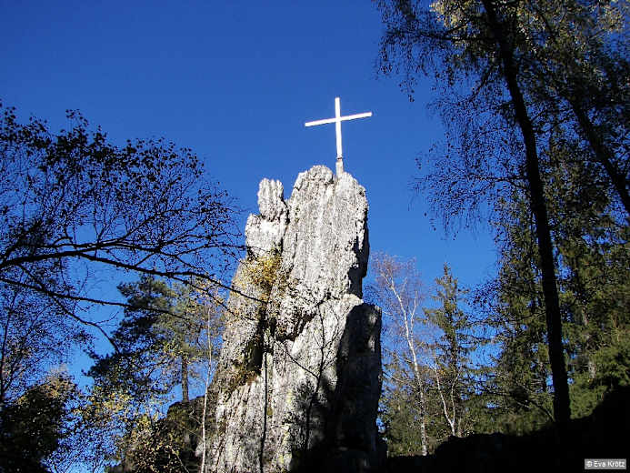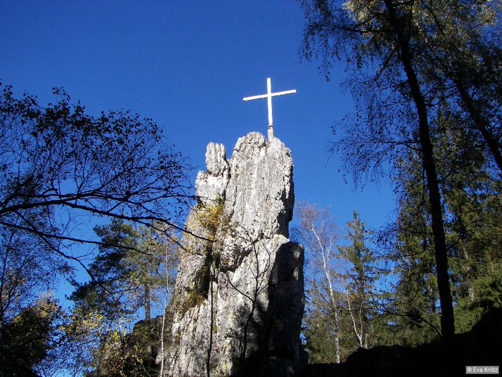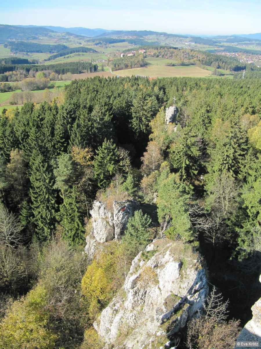 Nach der Besichtigung steigen wir vor dem „Fressenden Haus“, dem Torturm, rechts hinab und folgen dem Burglehrpfad rechts am Pfahl entlang. Wie die Höcker eines Drachens reihen sich die weißen Felstürme aneinander. Am Kreuzfelsen vorbei biegen wir knapp 10 Min. später rechts ab und kehren auf der anderen Pfahlseite, begleitet von mehreren Infotafeln, zurück. Etwas unterhalb befindet sich die Weißensteiner Dorfkapelle aus dem Jahr 1836. Nach dem Gläsernen Wald passieren wir den Almwirt Weißenstein und steigen rechts hinauf zum Feuerwehrhaus.