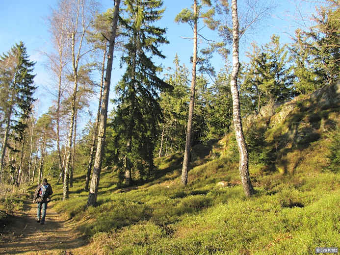 Die ersten weißen Quarzfelsen ragen auf und die typische magere Vegetation aus Kiefern, Birken, Heidelbeeren und Pfahlheide dominiert das Bild. Foto: Eva Krötz, Rother Bergverlag