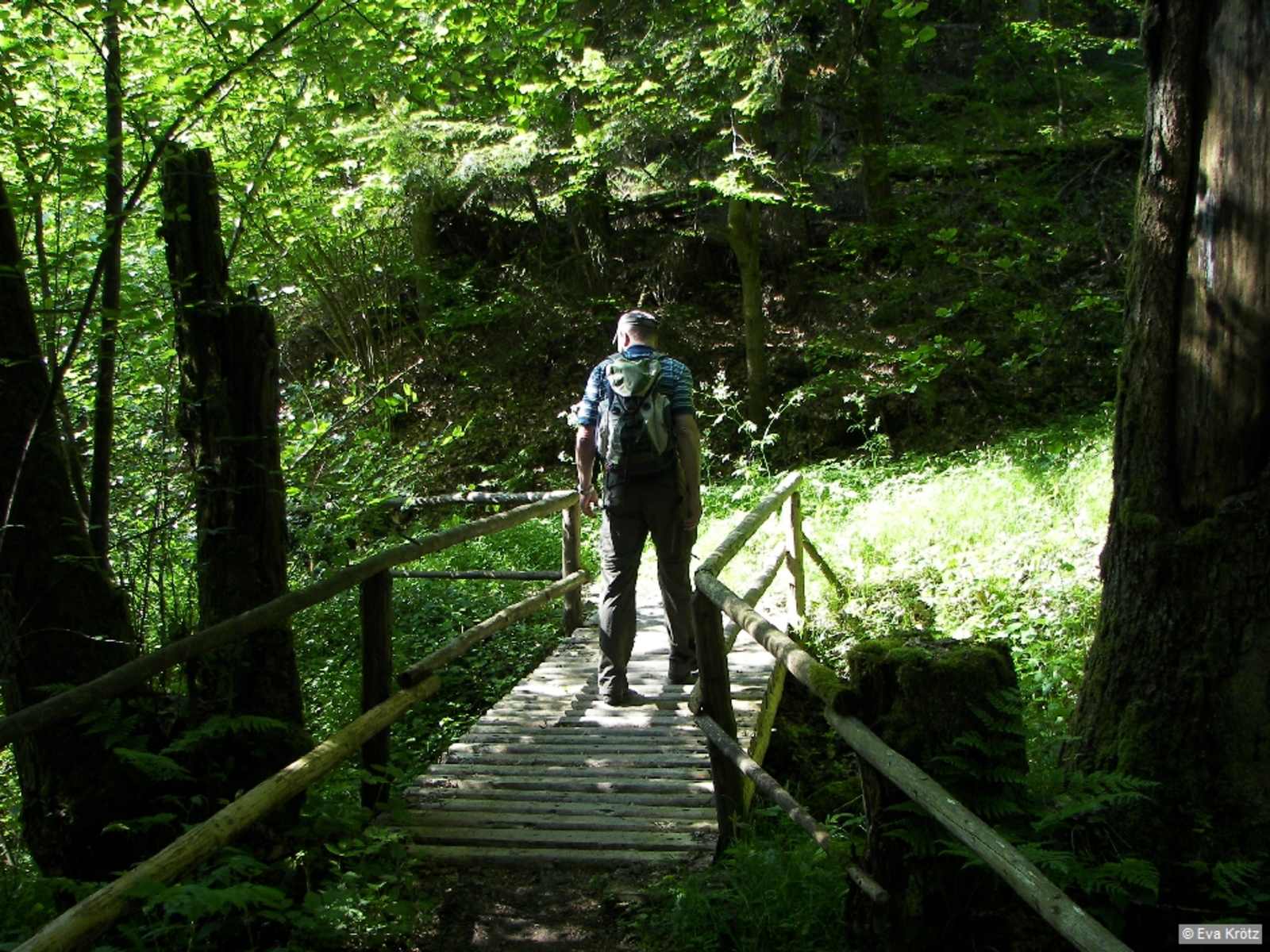 Ein breiter Weg biegt rechts weg, wir gehen links und es folgt ein hügeliger, wurzeliger Pfad, der mehrere Seitenbäche auf Holzbrücken überquert, bevor wir etwa eine Stunde nach Beginn die Bahntrasse passieren. Foto: Eva Krötz, Rother Bergverlag