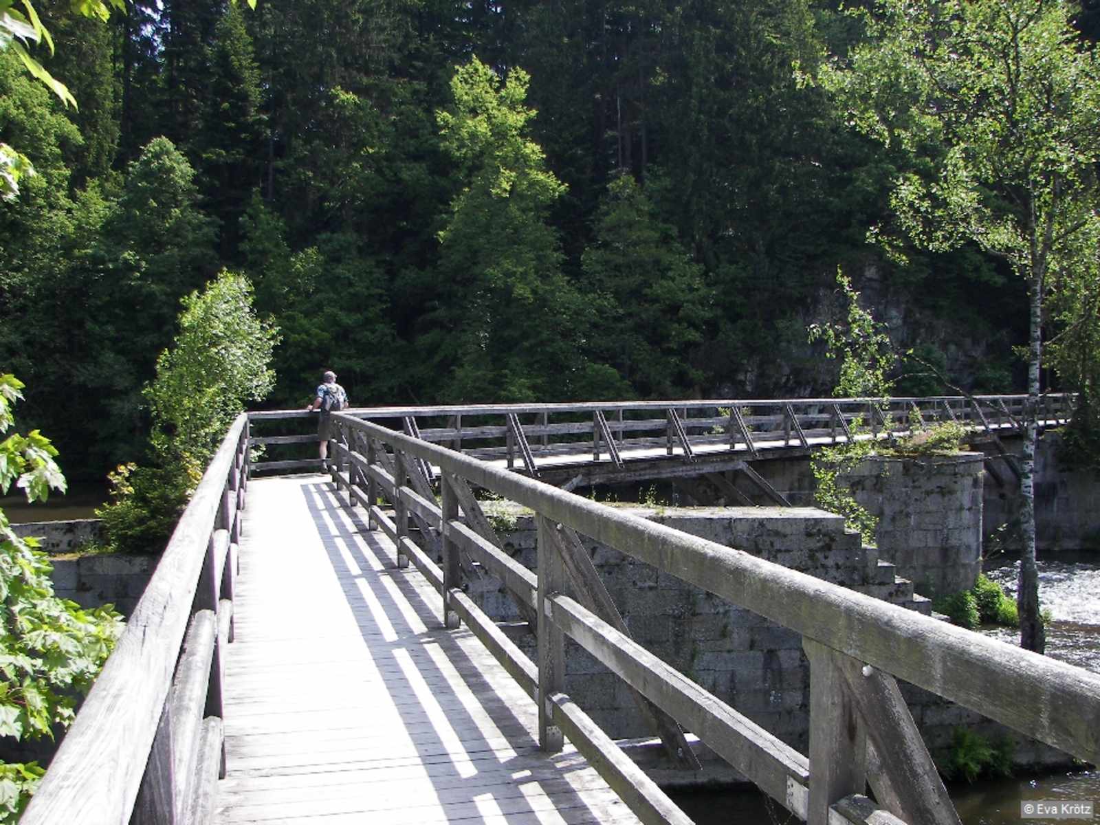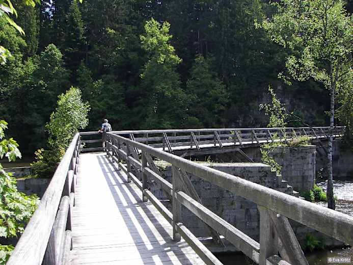 Ein Holzsteg führt über die ehemalige Triftsperre, deren steinerne Pfeiler noch Teil jenes Triftrechens sind, der das frei schwimmende Triftholz auffing und in den Stollen nach links leitete. Foto: Eva Krötz, Rother Bergverlag