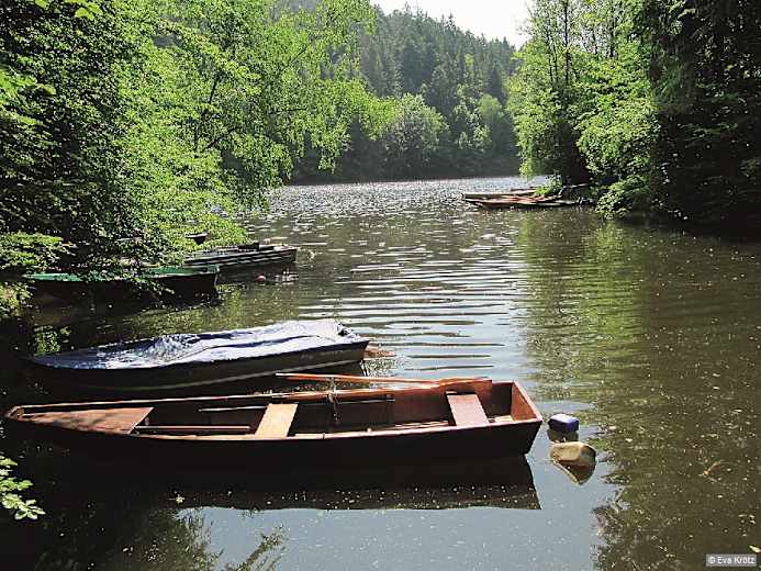Kähne dümpeln am Stausee Oberilzmühle im Wasser. Foto: Eva Krötz, Rother Bergverlag