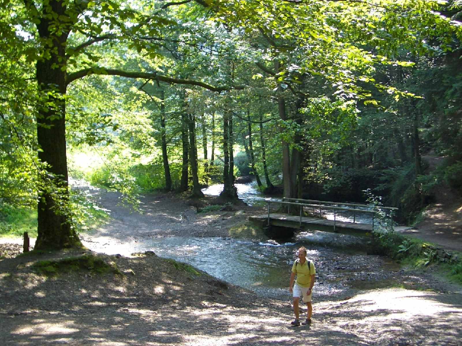 Am Parkplatz Schöllerhof überqueren wir die Landstraße, folgen ihr nach rechts und verlassen sie kurz darauf nach links in Richtung Eifgenbach (Markierung Winkel). Hinter der Brücke wenden wir uns rechts und folgen dem abwechslungsreichen Uferweg durch das wildromantische Bachtal (Winkel, Raute). Auf dem ersten Teilstück ist die nahe Landstraße zwar nicht zu überhören, doch die Idylle entlang dem kräftig strömenden Wasser entschädigt voll und ganz.