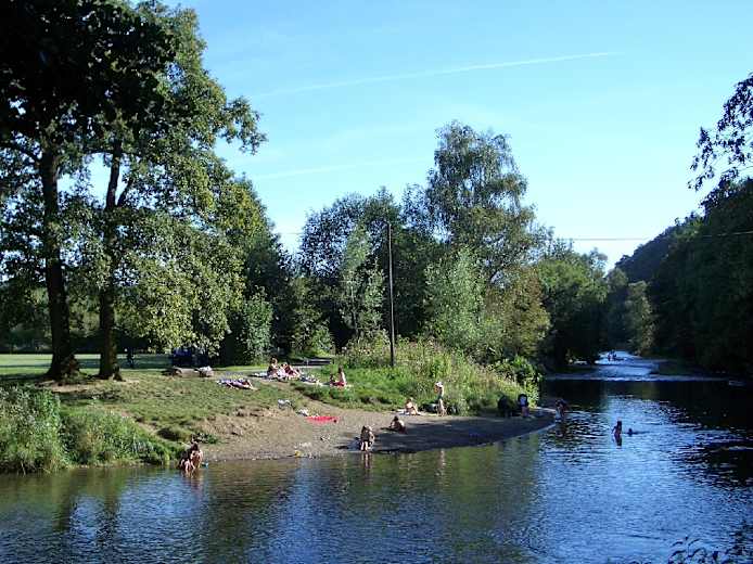 An einer Gabelung geht es links und mit A3 zum Fluss hinunter. Auf dem schönen Uferweg unter hohen Bäumen erreichen wir Wahlscheid-Schiffarth (Aggersteeg).