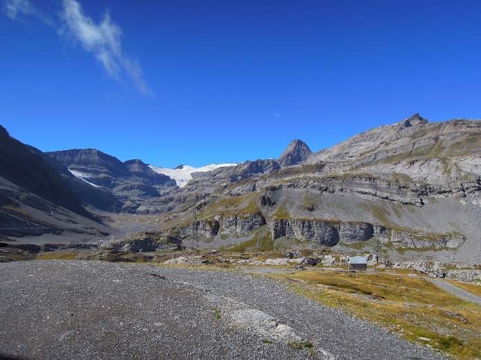 Vom Ausstieg, 2.270 m, aus der senkrechten Gemmiwand könnten wir rechts zur eigentlichen Passhöhe des Gemmipasses, 2.322 m, und zum Berghotel Wildstrubel bei der Bergstation, 2.346 m, der Seilbahn gehen; schneller ist es, zum Bach Lämmerendalu und zum Daubensee, 2.207 m, hinabzuwandern.