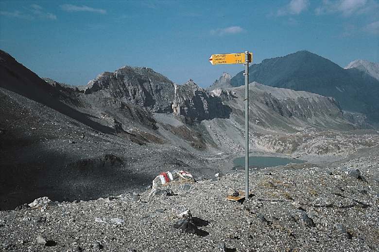 Weiter auf dem breiten Gemmiweg nach Schwarenbach, kurz darauf rechts vom Gemmipassweg abbiegen und unterhalb eines Felsbandes sanft ansteigend zum Weg durch die Rote Chumme.