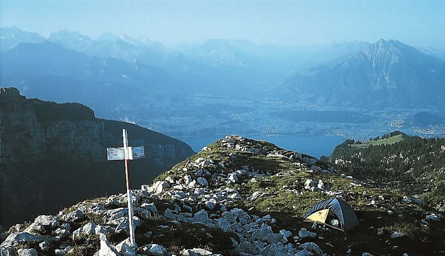 Freie Sicht aufs Mittelland und die Alpen bei einer Wanderung im Berner Oberland: Das doppelgipflige Sigriswiler Rothorn in der Schweiz (2.051 m und 2.033 m) gehört zur Silhouette der Landschaft am rechten Ufer des Thunersees.