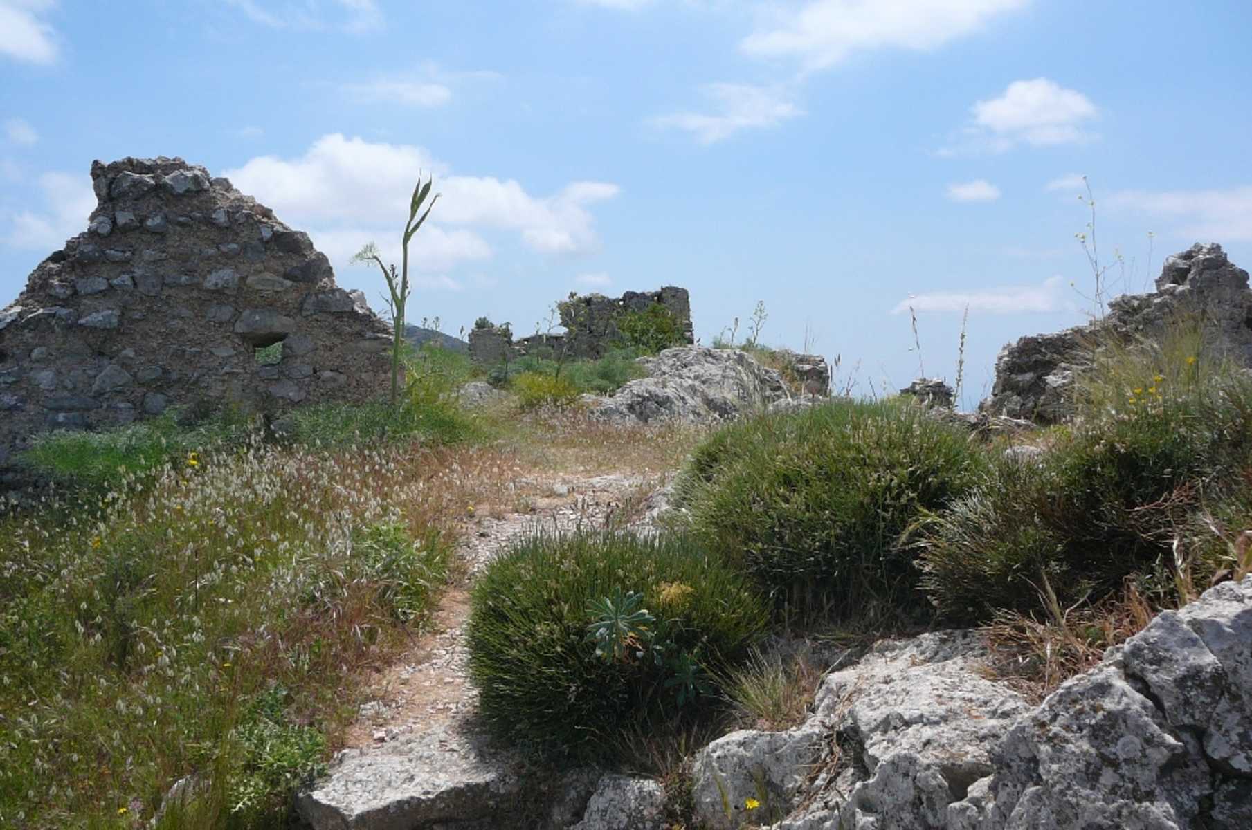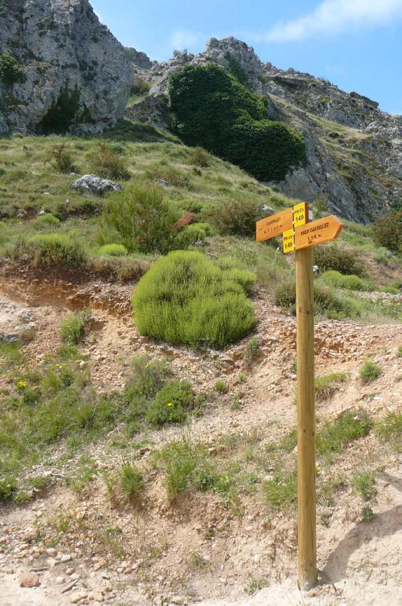 Recht steil und auf losen Steinen geht es nun bergab, dann beginnt ein kräftiger Anstieg bis zum Fuße der Penya El Castellet (Schild). Hier rechts und auf dem schmalen Pfad zur Burgruine (Vorsicht auf dem rutschigen Gras).