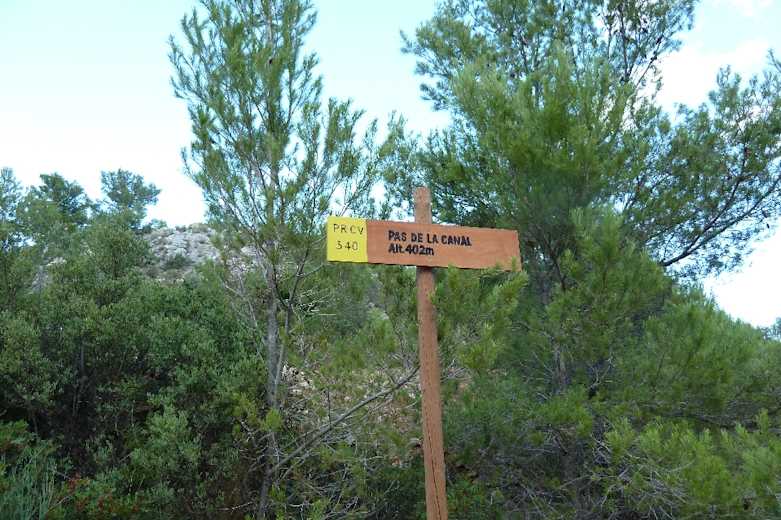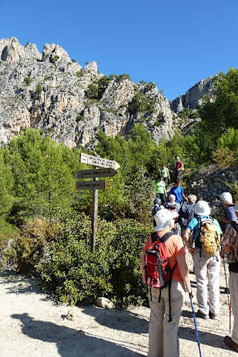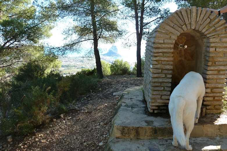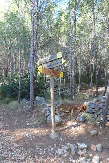 Wir ignorieren die Abzweigung „La Canal, Oltà nord“ (unser Rückweg) und wandern, vorbei an einer Quelle, einer Kette und einer weiteren Quelle mit Blick auf den Peñón de Ifach steiler empor. Abzweige nach links lassen wir auch unbeachtet. An einer Gabelung (Infoschild) gehen wir rechts hinauf.