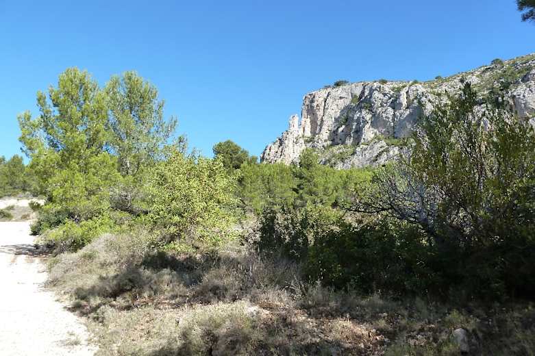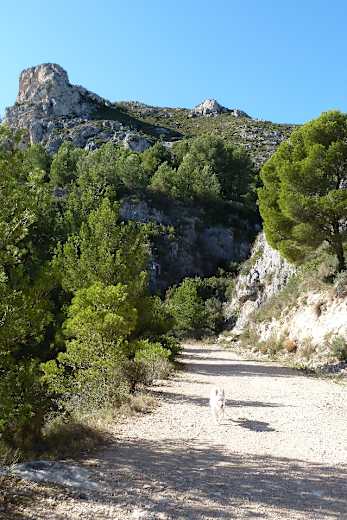 Nun auf dem stets ansteigenden Forstweg weiter. Den Abzweig nach rechts ignorieren wir (Abstiegsroute vom Gipfel, siehe Variante), dann schwenkt die Piste nach Westen. Auf der gegenüberliegenden Talseite erhebt sich die Sierra de Bèrnia und im Südwesten ist der Puig Campana auszumachen. Die Landschaft auf dieser Bergseite ist von typisch mediterranem Strauchwerk geprägt.