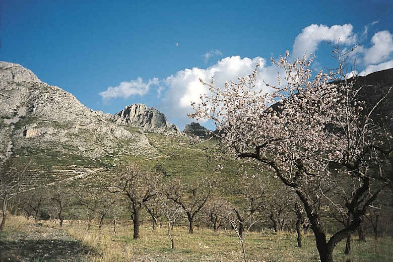 Leichte Wanderung durch ein schönes Tal zum Fuß eines Passes in Alicante: Die schöne Rundwanderung in Spanien führt in die herrliche Tallandschaft des Barranc de l’Arc mit seinen Mandel- und Olivenbäumen und spektakulären Aussichten.