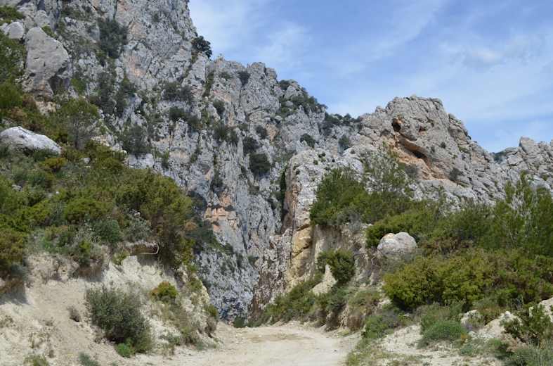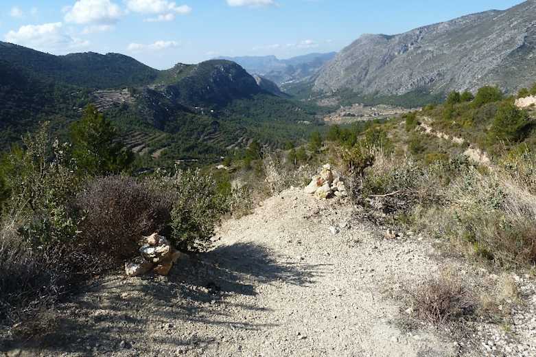 Hier nach rechts durch das Gebüsch hinauf zum Sattel an der Loma Sirventa, 875 m, mit herrlichem Ausblick ins Tal und zwischen zwei Felsen hindurch auf Sella in der Ferne. Dann geht es auf einem steilen und rutschigen Pfad durch stacheliges Gebüsch bergab.
