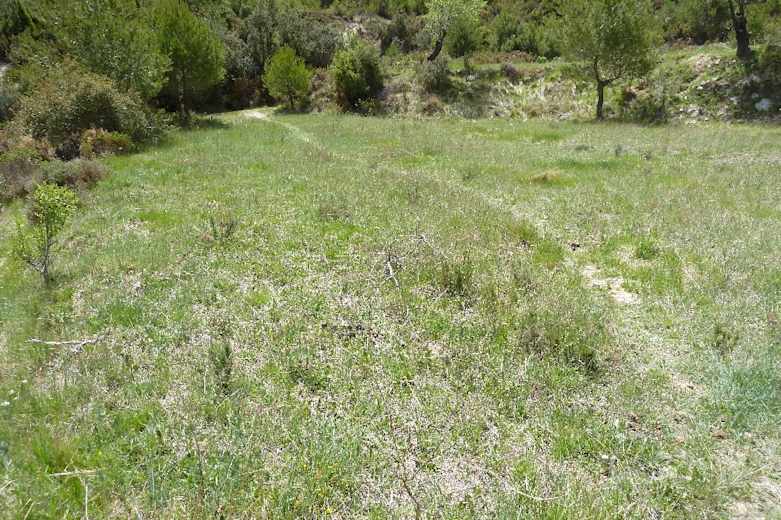 Wir folgen links am Haus vorbei dem undeutlichen, überwachsenen Trampelpfad, der bald in einen felsigen Pfad übergeht. Dann steigen wir links einer tiefen Schlucht entlang aufwärts bis zu einer Quelle mit Wassertrog (auch etwas verwachsen). Weiter auf dem ausgewaschenen Pfad kommen wir zu einer Feldterrasse hinauf und folgen dem Trampelpfad über elf Terrassen bergan.