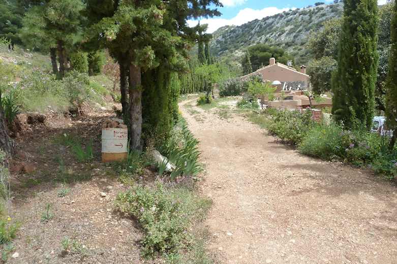 Nach insgesamt etwa 30 Min. erreichen wir die Häusergruppe Cases de l’Arc. Weiter hinauf passieren wir die Zufahrt zu einem Haus (La Bodega) und etwas später gehen wir an einer Weggabelung rechts. Ca. 1 km weiter passieren wir kurz nach dem Mas de Indoro den Einstieg links zur Peña Mulero. Wir ignorieren alle rot-blau markierten Pfade nach links und rechts und erreichen die Gabelung, 690 m, am Fuß des Paso de los Contadores (Schild „Coto privado de caza“; nach links geht es zum Pass hinauf, s. Varianten).