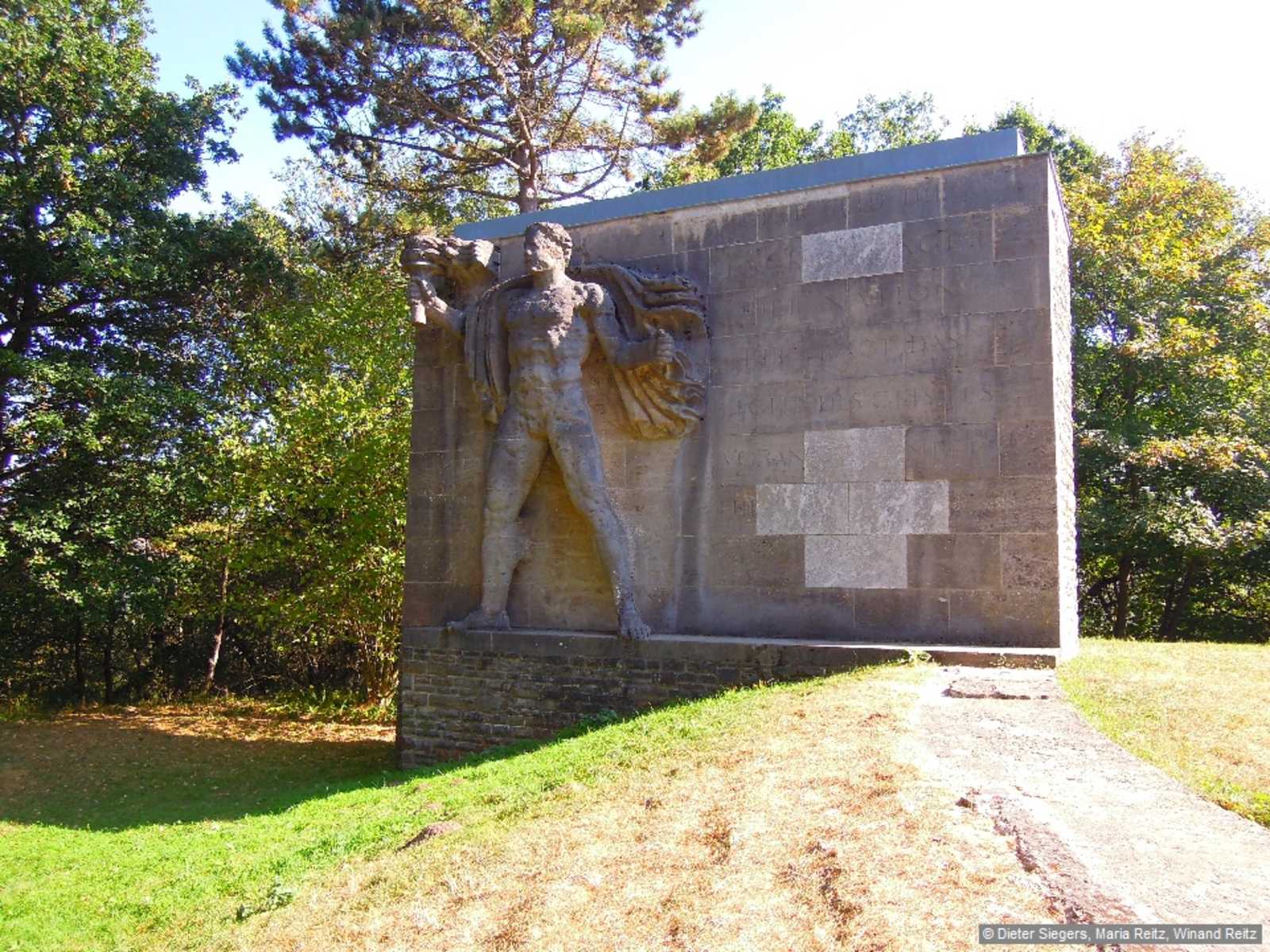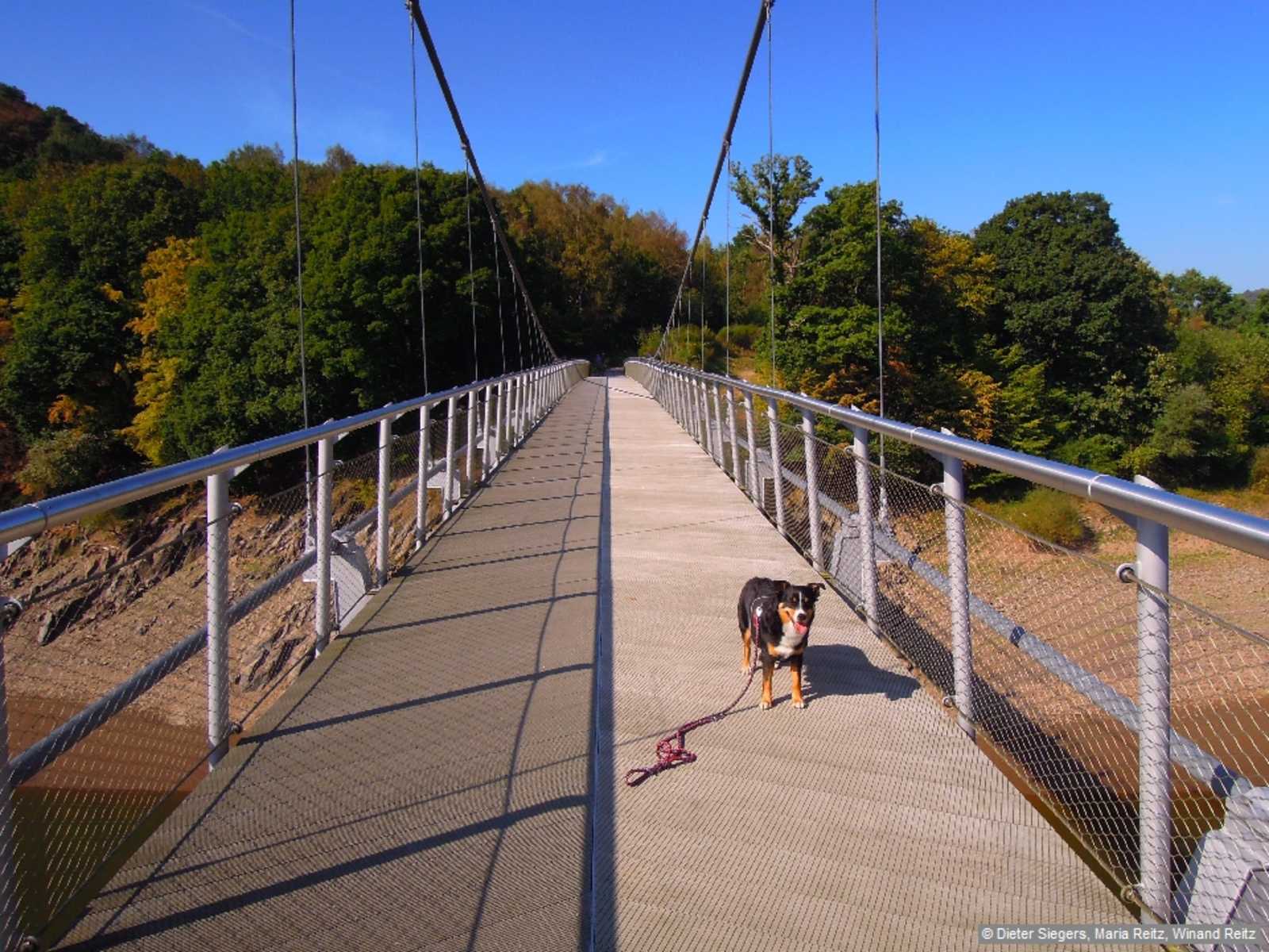 Wieder zurück am Aussichtsplateau, gelangen wir nach rechts über Stufen und nach 20 m halb links über eine weitere Betontreppe hinunter zu einem Betonweg, auf dem wir zunächst nach rechts oberhalb des „Kameradschaftshauses 14" vorbeikommen. Hinter diesem biegen wir nach links auf die Betonstraße hinunter und gleich nach rechts auf Weg zur Steinskulptur „Der Fackelträger". An dieser folgen wir einem Pfad steil hinunter durch den Wald zu einem Teerweg und gelangen nach rechts hinab zum Urftsee. Über die Victor-Neels-Hängebrücke, dann nach rechts, wandern wir am Urftsee entlang auf dem Fahrrad- und Wanderweg, dem wir bis nach Gemünd folgen.