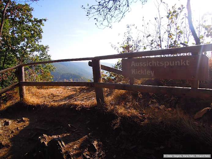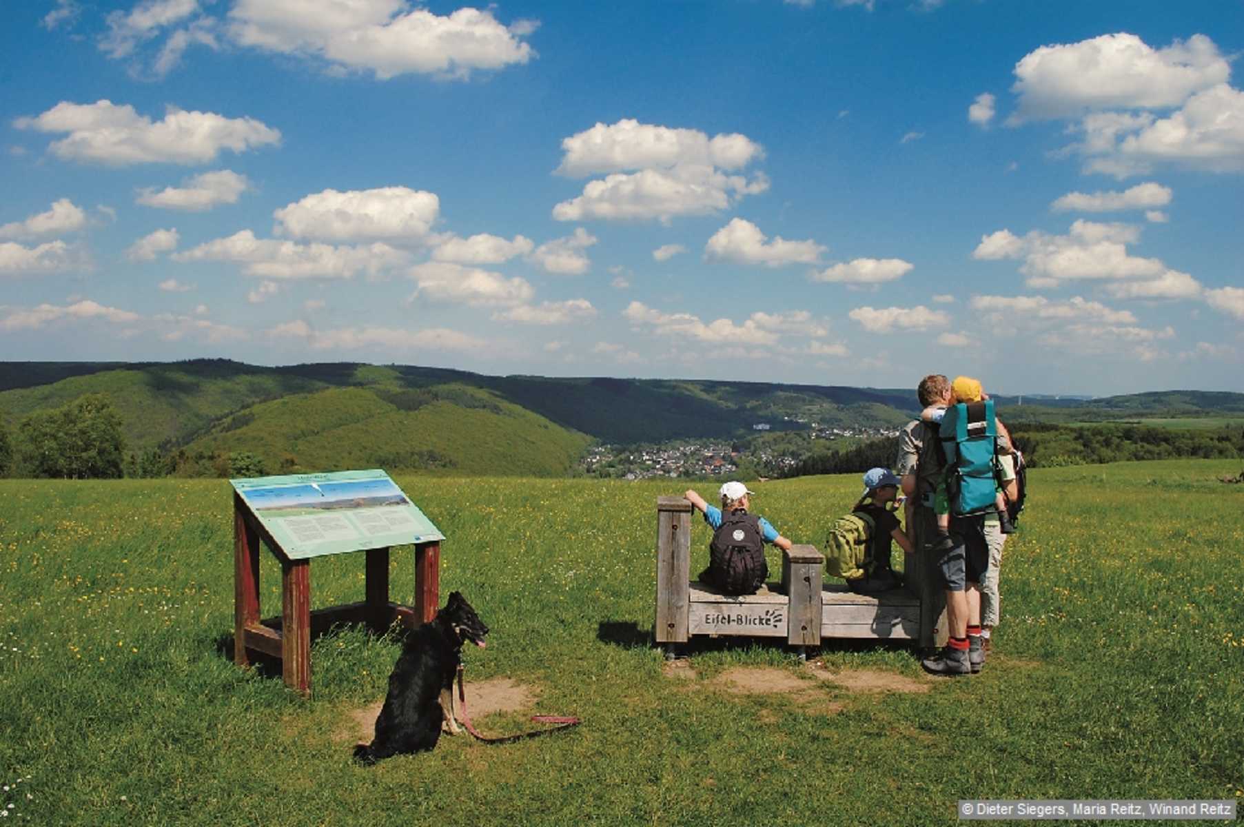 Vorbei an der Nationalpark-Infotafel erreichen wir nach 100 m einen Vierwegetreff. Hier nach rechts, leicht abwärts und dann hinauf wieder an einem Abzweig vorbei. Hinter diesem steil hinab (Ww. Vogelsang 4,6 km), überqueren wir den Lahsbach und gehen durch das schöne Tal hinauf bis zum Schild „Bauerncafé 1,0 km" an einer Gabelung. Hier nach rechts ansteigend treten wir nach 500 m aus dem Wald in Wiesenlandschaft und blicken bald auf den Ort Morsbach. Vor diesem biegen wir spitzwinklig nach rechts auf einen Teerweg und folgen diesem zum Eifel-Blick Modenhübel, 503 m. Eine Infotafel erläutert uns hier die Aussicht. Von dort auf naturbelassenem Weg abwärts, nach kurzer Zeit wieder im Wald, erreichen wir den Aussichtspunkt Kickley, 464 m. Von hier haben wir einen grandiosen Blick auf Gemünd-Malsbenden und das Urfttal.
