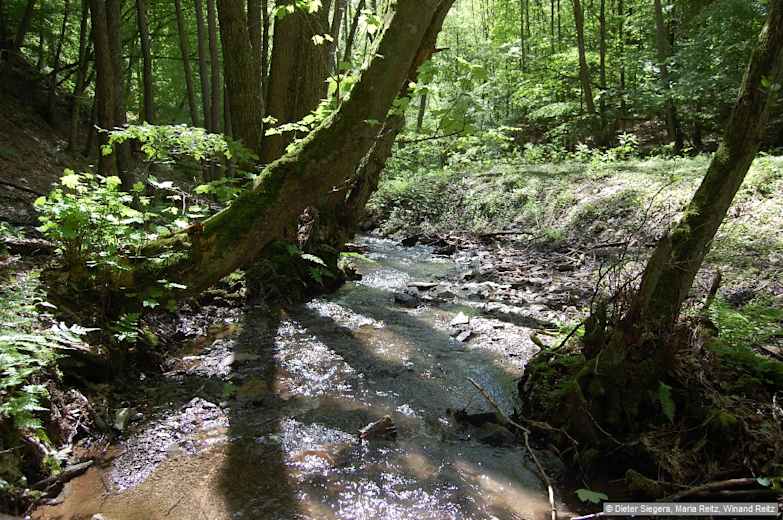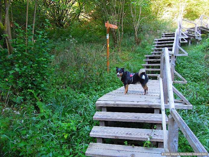 Wir überqueren den Morsbach. Hinter diesem geht es auf einer Holztreppe und auf Pfad in Serpentinen steil bergan. Foto: Dieter Siegers, Maria Reitz, Winand Reitz, Bergverlag Rother