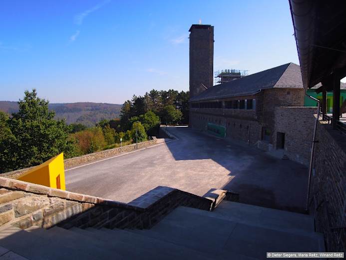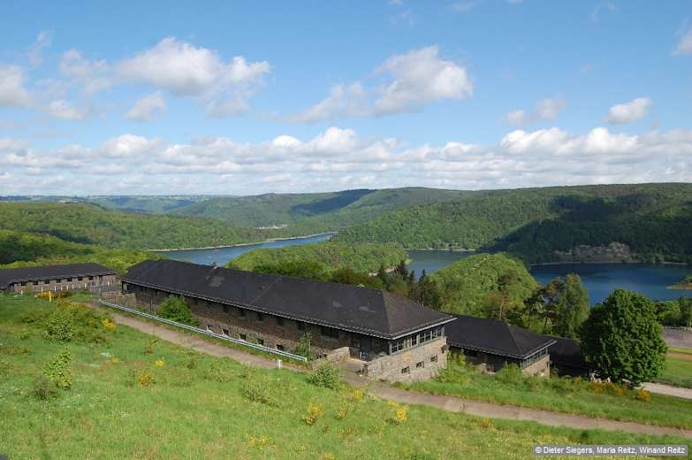 Wir folgen weiter dem Ww. „Vogelsang 2,2 km" abwärts, biegen am Schiffersberg (Ww. Vogelsang 1,9 km) vom Weg nach links abwärts über breiten Pfad, der bald in einen Holzsteg übergeht, und überqueren den Morsbach. Hinter diesem geht es auf einer Holztreppe und auf Pfad in Serpentinen steil bergan. Nach kurzer Zeit erblicken wir am Ww. „Vogelsang 1,2 km" ein Gebäude des Vogelsang IP. Anschließend stoßen wir auf eine Straße, gehen auf ihr nach links und queren die Haupteingangsstraße zum Vogelsang. Nun kurz die Betonstraße entlang, dann über Weg nach links, gleich wieder rechts und zu einem Querweg. Diesen kurz nach links, dann rechts, vorbei an einem Picknickplatz mit Blick auf Wollseifen, woraufhin wir eine weitere Betonstraße erreichen. Auf ihr hinunter, vorbei an den ehemaligen Hundertschaftshäusern, verlassen wir den „Eifelsteig + Wildnis-Trail". Wir folgen noch 30 m der Betonstraße und steigen hinter der gelben Infotafel „Vogelsang IP" über Stufen nach rechts vor dem Gebäude Nr. 5 hinauf zum sichtbaren Aussichtsturm (gelbe Informationstafel: Naturschutzhaus Eifel-Ardennen + Besucherzentrum). Vom überdachten Aussichtsplateau am Forum Vogelsang IP, 472 m, genießen wir den schönen Blick auf den Urftsee und machen noch einen Abstecher in die denkmalgeschützte Anlage mit modernem Besucherzentrum.