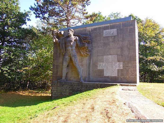 An diesem Denkmal folgen wir einem Pfad steil hinunter durch den Wald zu einem Teerweg und gelangen nach rechts hinunter zum Urftsee. Foto: Dieter Siegers, Maria Reitz, Winand Reitz, Bergverlag Rother