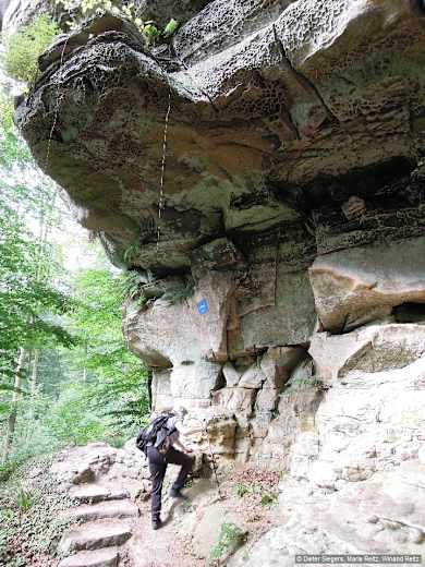 Von der St.-Bartholomäus-Kirche in Consdorf spazieren wir über die Straße „Buurgkapp“ zum Friedhof, dann die Straße links (Weg Nr. C1) zum Campingplatz „La Pinede“. Hier halten wir uns rechts hinab über Stufen durch vorwiegend Buchenwald und überqueren im Anschluss eine Brücke. Jetzt steigt der Pfad wieder an zu den Budderkammer-Felsen (Ww. Nr. C6 + gelbes X), unter denen vorbei wir die Brücke über den Alsbach überschreiten. Dann nach links abwärts zum überhängenden Felsen der Schelmenlay mit Sitzbank. Direkt hinter ihr nach rechts auf Pfad C6 (gelbes X) hinauf an wildromantischer Felslandschaft vorbei, erreichen wir nach etwa 600 m den Ww. „Consdorf 2,3 km/Consdorfer Buurgkapp 3,1 km“. Hier machen wir einen Abstecher (50 m) nach rechts über Stufen hinauf zur engen Schlucht Rammelay. Wieder zurück am Wegweiser folgen wir dem gelben X rechts abwärts unterhalb der Rammelay zu einem Querpfad. Hier nach links gelangen wir nach 250 m zu einem Abzweig, dem wir rechts hinunter zum Dosbaach folgen (weiterhin gelbes X).