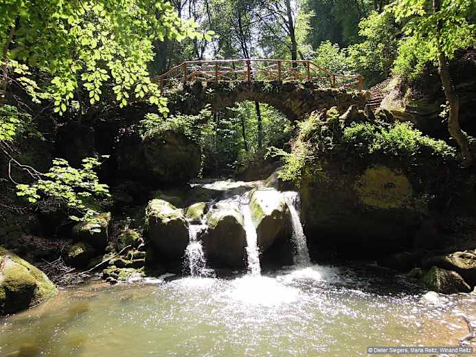 Der Wasserfall mit drei Kaskaden, über den sich eine Steinbrücke schwingt, liegt mitten im wildromantischen Müllerthal (franz. Mullerthal). Foto: Dieter Siegers, Maria Reitz, Winand Reitz, Bergverlag Rother