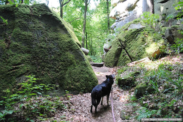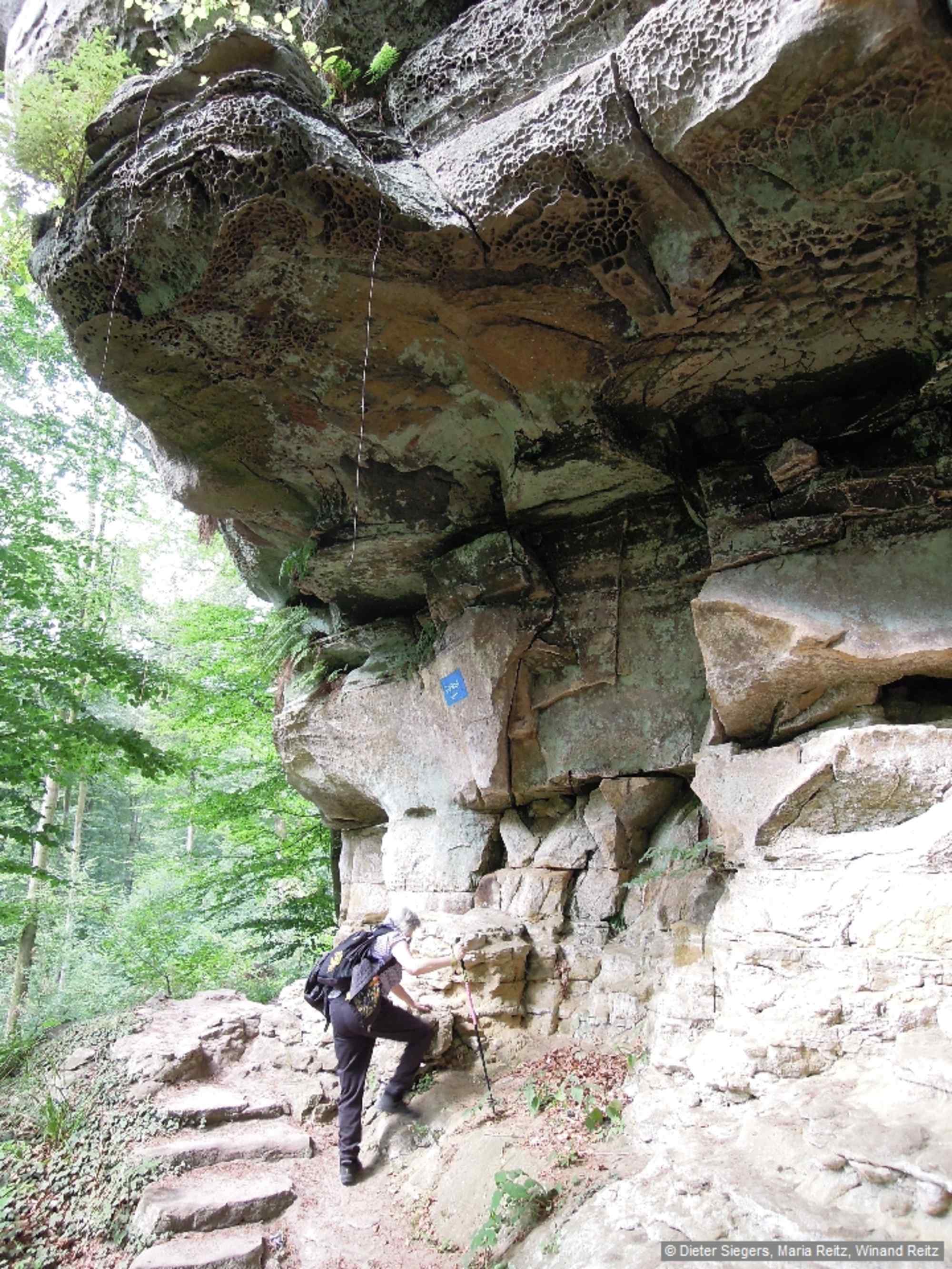Der Pfad steigt zu den Budderkammer-Felsen (Ww. Nr. C6 + gelbes X) an, unter diesen vorbei zur Brücke über den Alsbach. Foto: Dieter Siegers, Maria Reitz, Winand Reitz, Bergverlag Rother