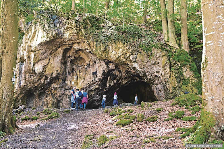 Auf dem romantischen Wanderweg zu den Höhlenruinen über dem Wiesentknie: Die Oswaldhöhle, eine Durchgangshöhle, bildet den Auftakt eines zu Recht romantisch genannten Wanderwegs, bei dem sich ein Höh(l)e(n)punkt an den anderen reiht: die verwunschen im Wald liegende Höhlenruine des Quackenschlosses, der aussichtsreiche Felsturm des Adlersteins und die eindrucksvolle Höhlenruine der Riesenburg, deren Hauptattraktion eine begehbare Felsenbrücke ist. Der zweite Teil der Wanderung wird von der beschaulichen Idylle des Unteren Aufseßtals bestimmt.