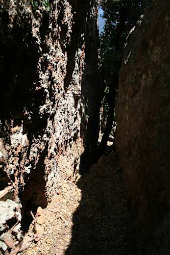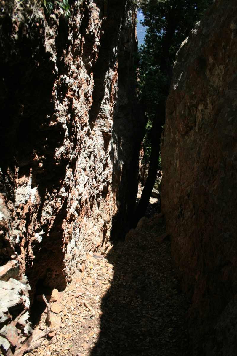 Hier wandern wir rechts haltend auf dem Pfad bergan. An der Gabelung nach 3 Minuten halten wir uns rechts. Der Pfad zieht jetzt äußerst steil, mitunter auch sehr abschüssig bergan (meist jedoch guter Halt an Bäumen und Felsen).