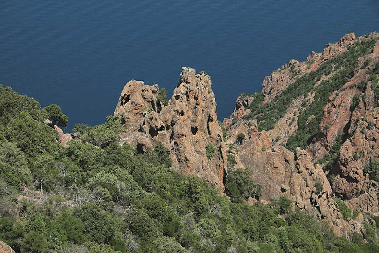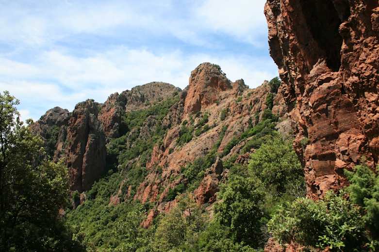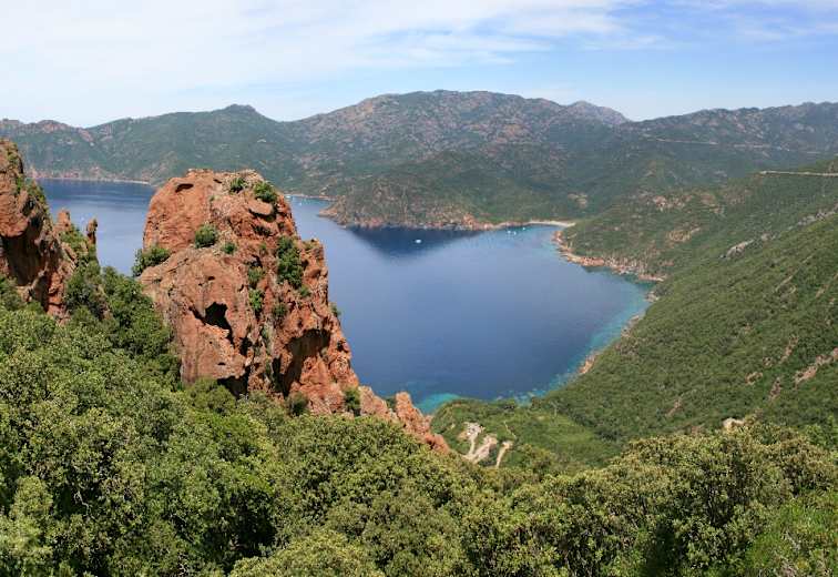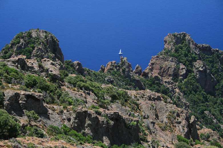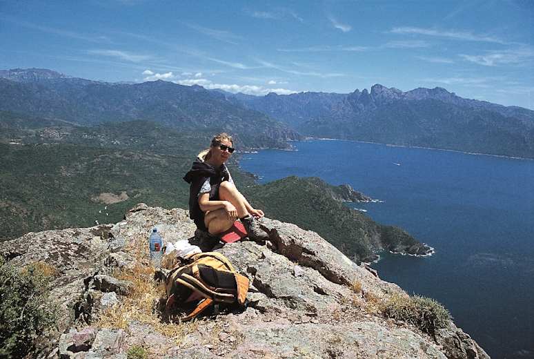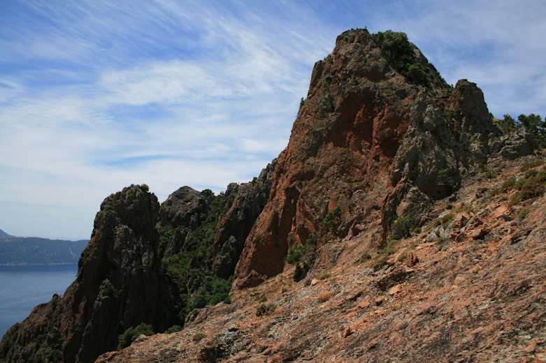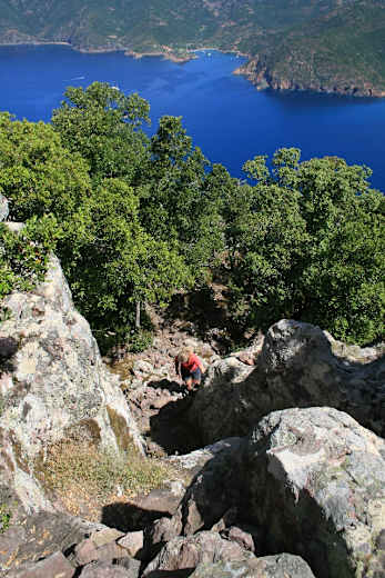 Über diesen geht es weiter sehr steil bergan, mit großartigem Blick zur Scandola-Halbinsel und nach Girolata. Nach einer knappen Viertelstunde erreichen wir den Fuß einer höheren Felswand, an der wir uns links halten und durch die breite, von Felsen eingefasste Rinne aufsteigen.