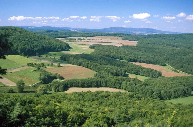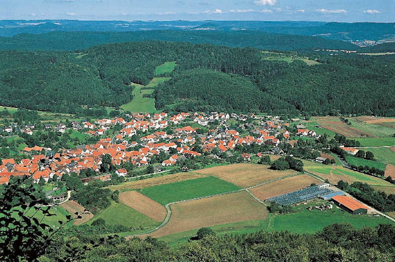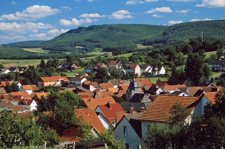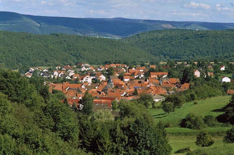 Wunderbar ist der Blick auf das nahe Weißenborn und den weit entfernten Heldrastein. Ein Feldweg bringt abwärts zur Landstraße, auf der man rechts in wenigen Minuten zurück nach Weißenborn gelangt.