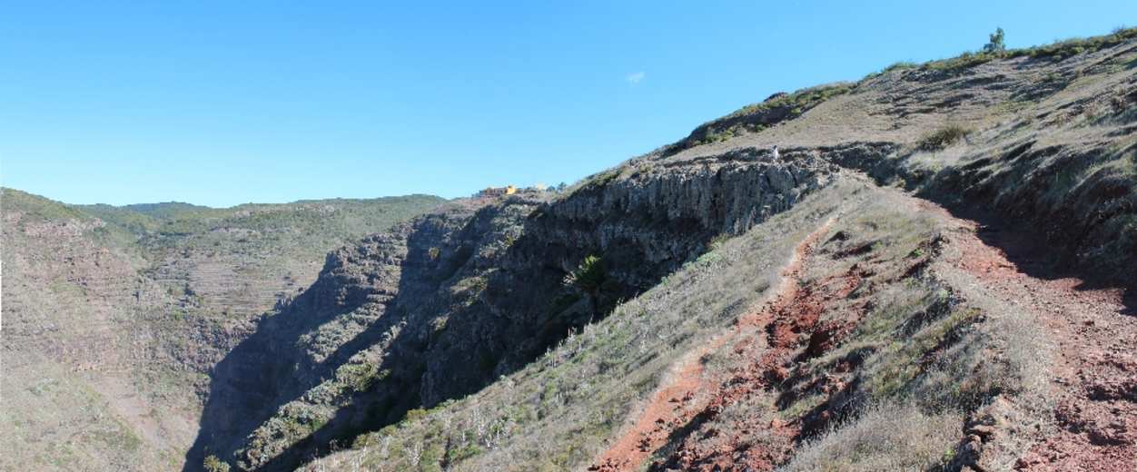 Hier wendet sich der markierte Wanderweg rechts dem breiten Camino zu, der zunächst eben im Hang verläuft und dann gemütlich absteigt – nur hin und wieder sind etwas steilere Passagen eingestreut. Nach 25 Minuten folgt eine kurze Rechtsschleife, wenig später wird eine Felswand ein wenig rechts haltend umgangen. Mit fantastischem Blick auf das Valle Gran Rey geht es anschließend in einem kleinen Talkessel weiter hinab.