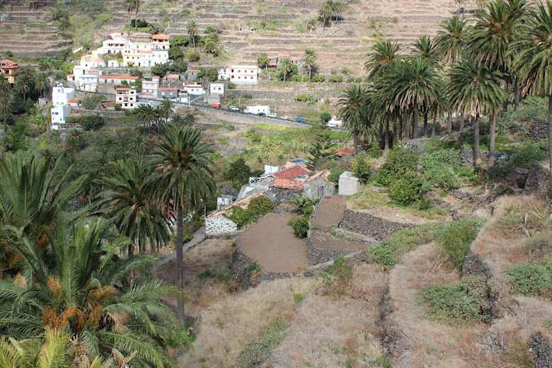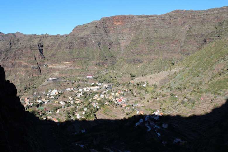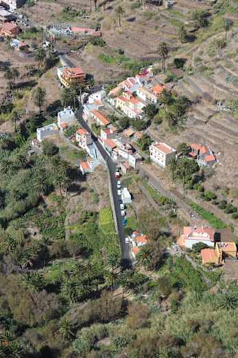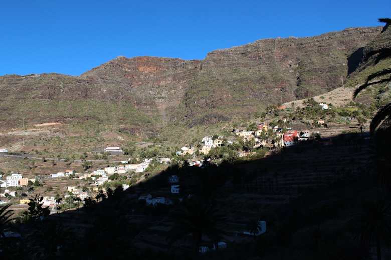 Schöner aber ist die Fortsetzung des Abstiegs durch das Valle Gran Rey mit Wanderweg 12 [PR LG 12.2]. Während der gemütlichen Wanderung auf der Straße können wir die herrliche Kulturlandschaft, die hübschen Häuser und paradiesischen Gärten betrachten. Die Straße führt in einer Rechtsschleife hinab und gabelt sich im Ortsteil El Hornillo (rechts könnte man durch den Barranco zur Hauptstraße auf der anderen Talseite hinüberwandern).