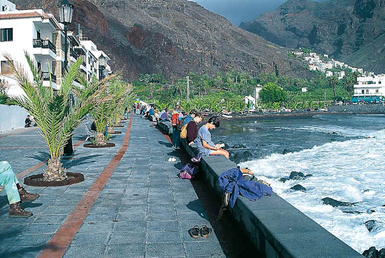 Auf diesem weiter talwärts bis zur Straßenbrücke in La Calera. Wer noch weiter zur Playa de Valle Gran Rey will, geht am Verkehrskreisel rechts die Straße nach La Playa hinab (¼ Std.) – man kann auch geradeaus auf dem Fahrweg direkt zur Playa hinabgehen.